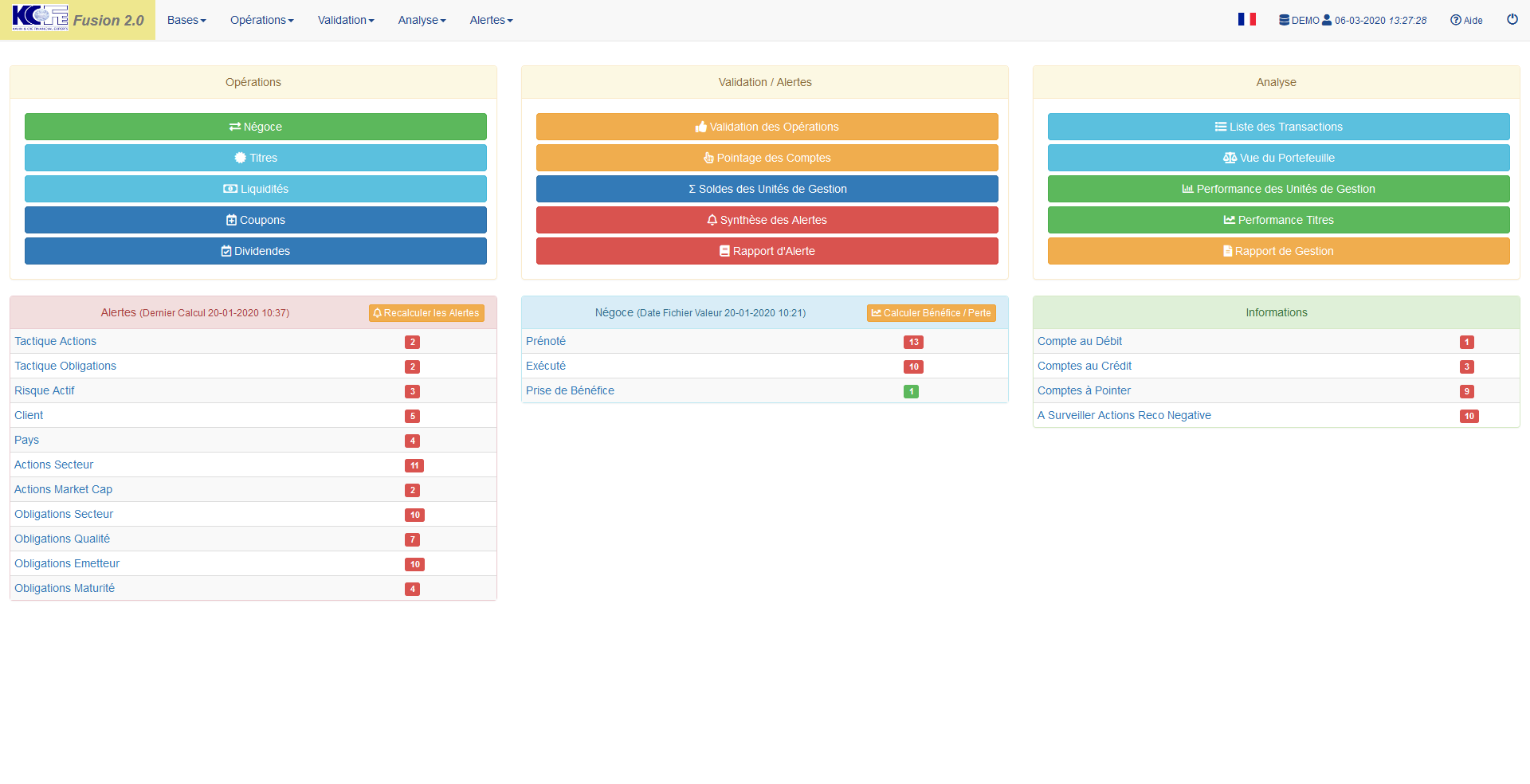 Trois blocs de raccourcis, Opérations, Validation / Alertes et Analyse, donnent un accès rapide aux fonctions les plus courantes