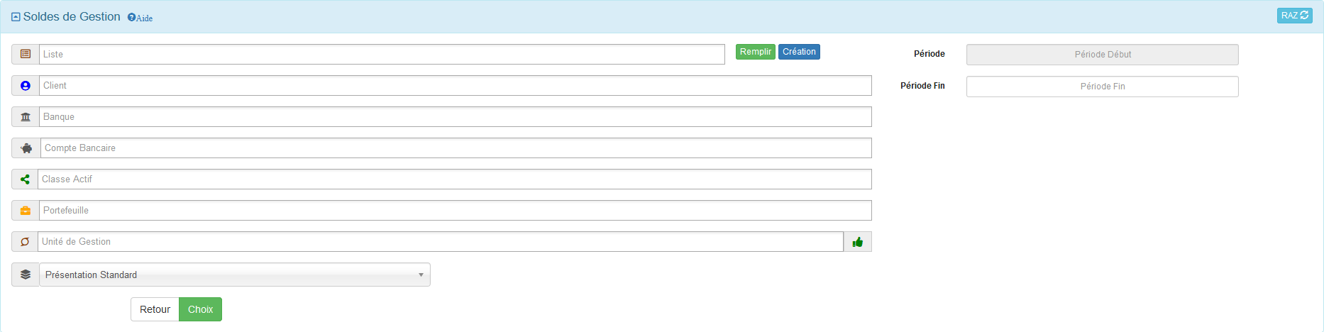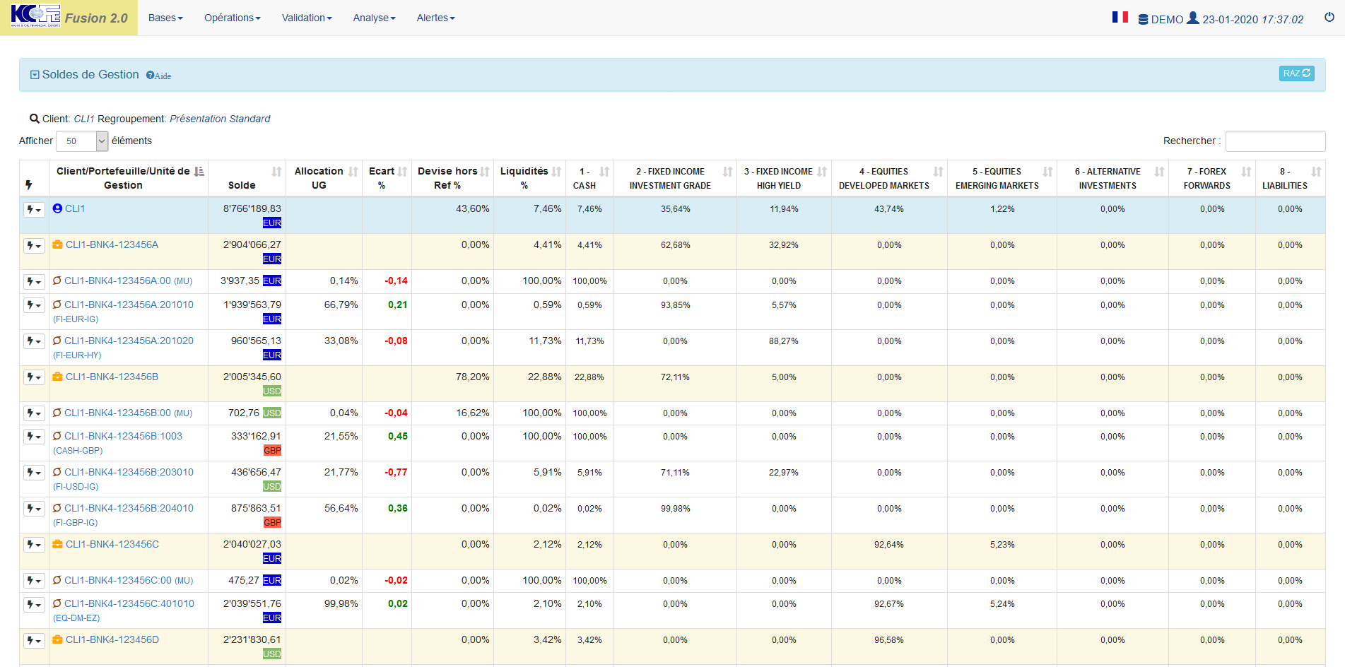 - Liquidités % = pourcentage des liquidités du client, portefeuille ou unité de gestion