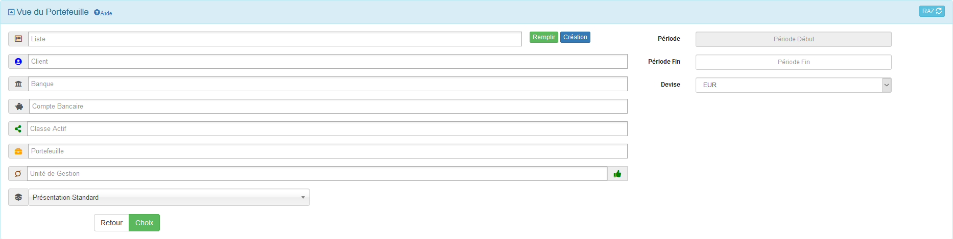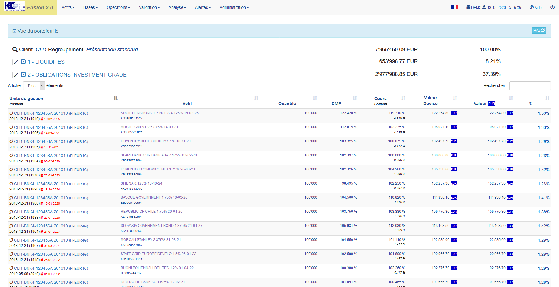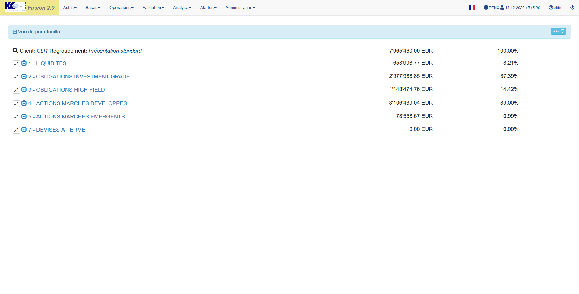 Par défaut, le regroupement est fait selon une présentation standard des classes d’actifs, qui peut être modifiée par la boite de Regroupement