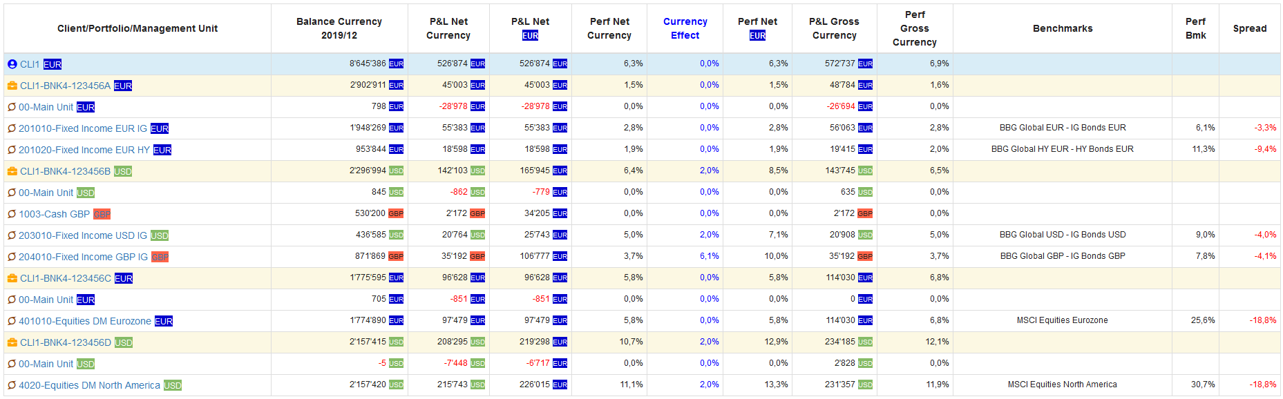 - Currency = report currency, reference currency for selected client, portfolio or management unit